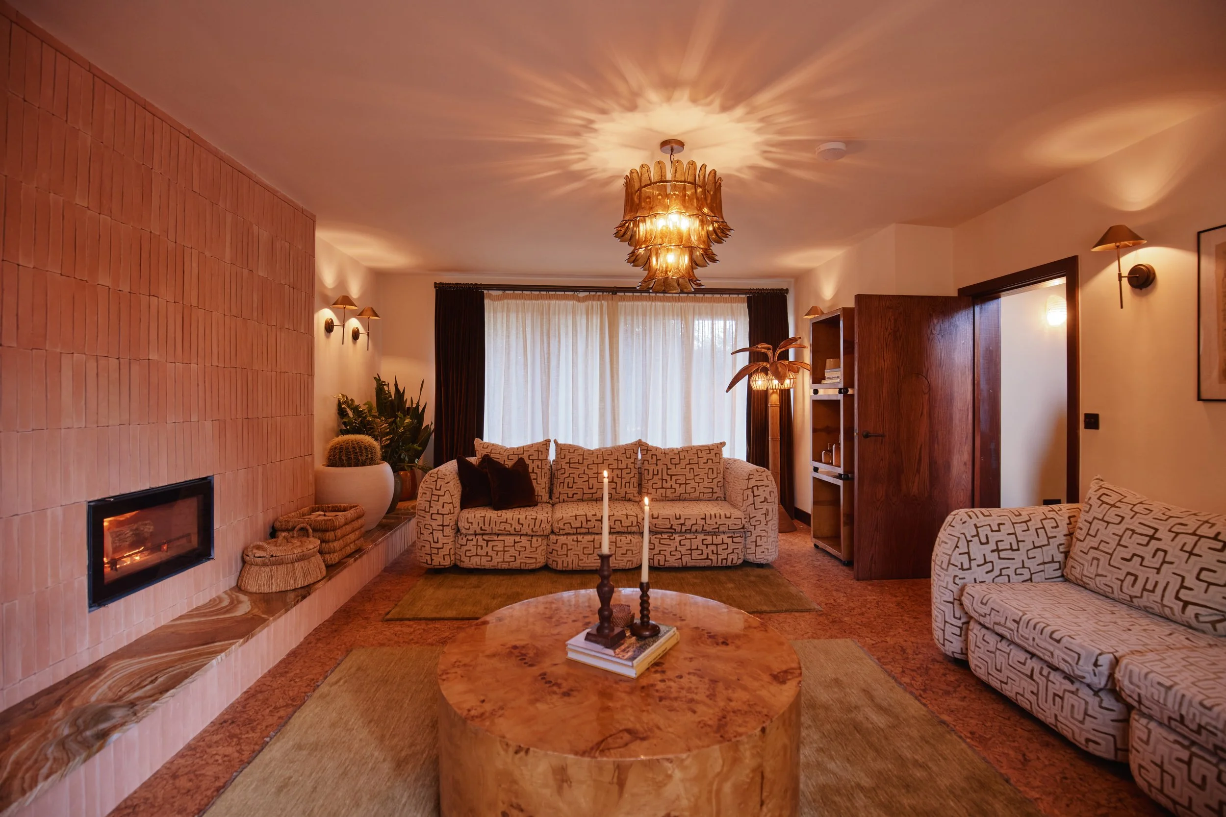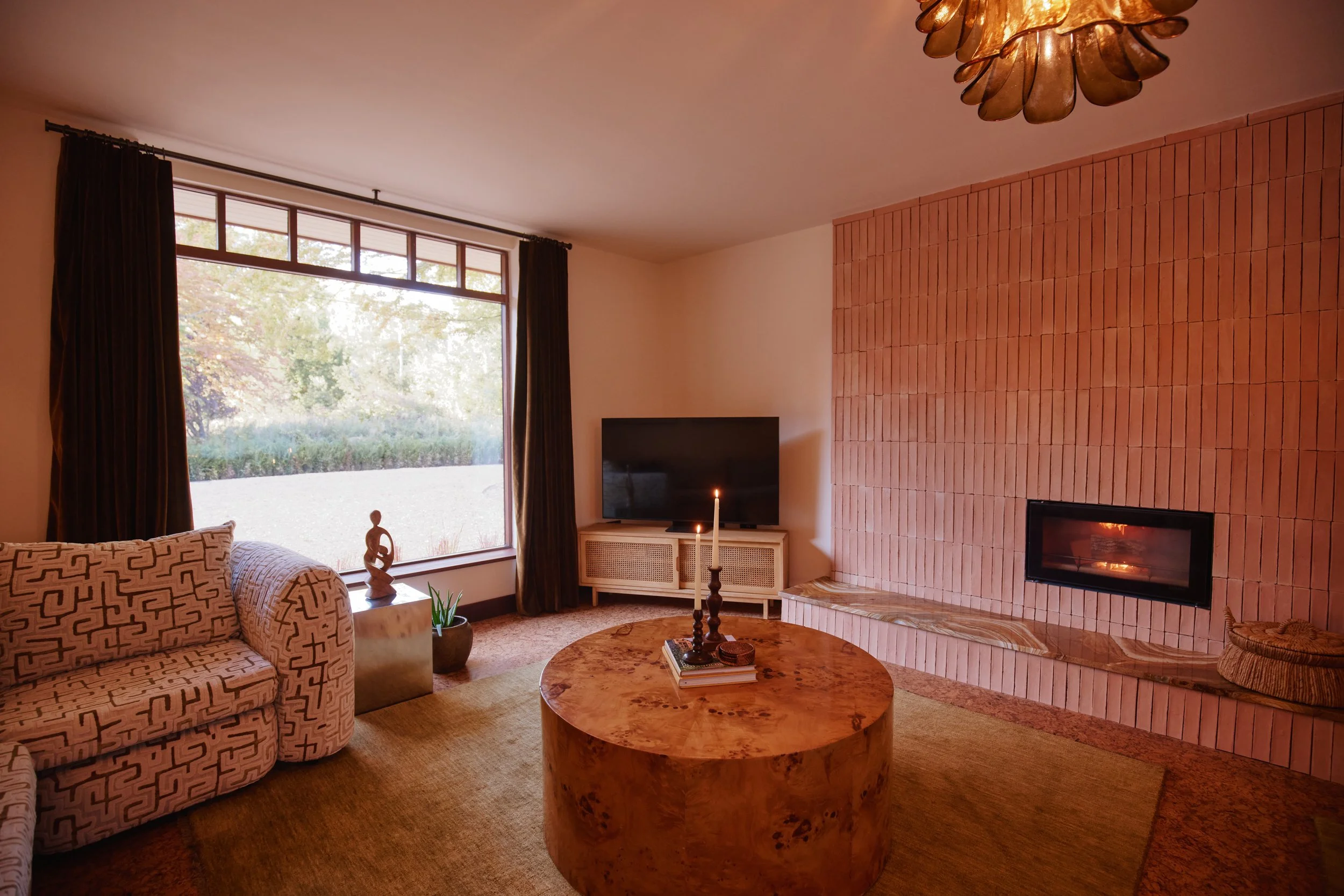 The living room is relaxed and welcoming, centred around a working fireplace.